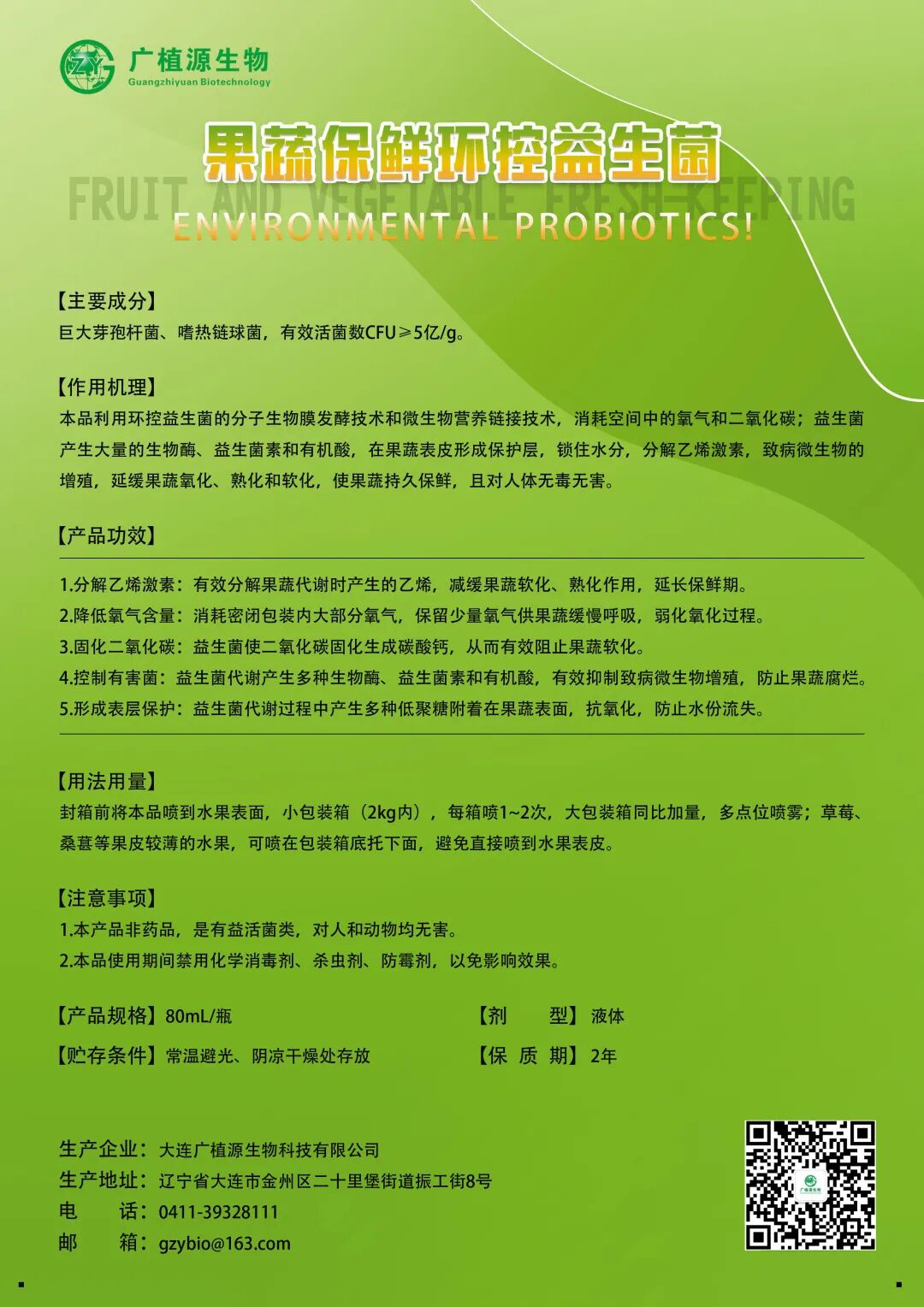 果蔬保鮮環(huán)控益生菌應(yīng)用純生物技術(shù)抑制果蔬的呼吸,控制果蔬成熟衰老的速度,防霉防腐,抗氧化,控制水果中微生物的生長(zhǎng),保持相對(duì)的濕度,避免內(nèi)部水分蒸發(fā),以延長(zhǎng)其保鮮期,安全*綠色環(huán)保的純生物保鮮劑,能減少有害物質(zhì)在食物上的殘留問(wèn)題,具有高安全性、保鮮*顯著等特點(diǎn),降低失水率和爛果率,增加經(jīng)濟(jì)效益,提高食品安全保障,滿足消費(fèi)者對(duì)品質(zhì)的期望,推動(dòng)果蔬產(chǎn)業(yè)高質(zhì)量健康發(fā)展。
